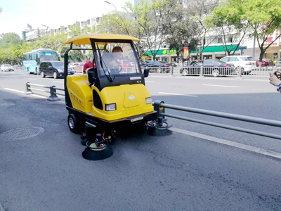 掃地車的前端裝置了兩個旋轉刷子,當掃地車向前行走時、前述的刷子便會將地上的垃圾和沙土透過旋動而帶到車輛的中間,隨而利用掃地車的真空吸頭將垃圾和沙土抽吸進掃地車上的廢物收集箱中。
