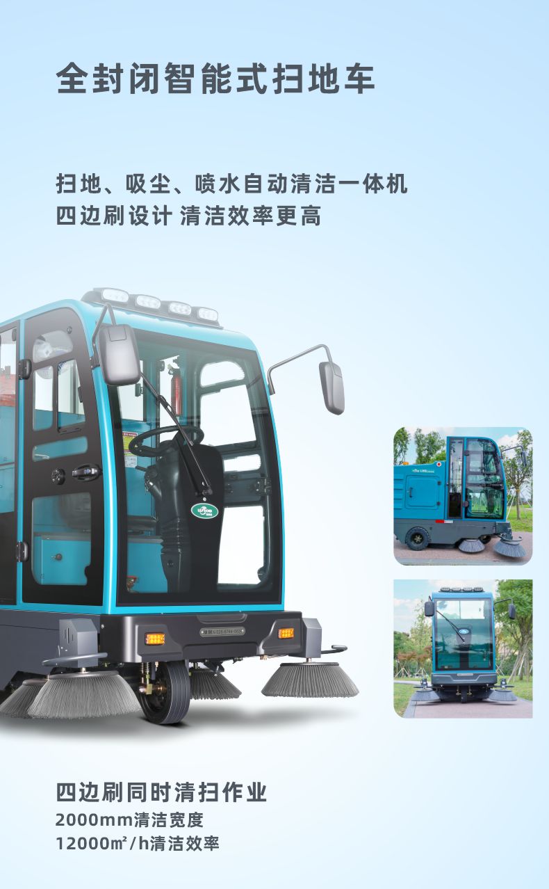 LMB2000S智能式全封閉掃地車為吸塵、掃地、噴水相結(jié)合的自動清潔一體機,為戶外環(huán)境下使用,主要用于公園、環(huán)衛(wèi)、保潔公司、物業(yè)管理公司、廣場、高校的室外清掃。